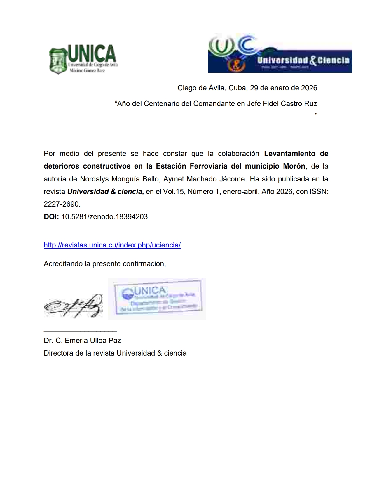 Leer más Leer más acerca de Publicación continuaDr. C. Emeria Ulloa Paz Directora / Editor en Jefe | MSc. Alexy Rodríguez Pérez Editor | Reinaldo Alvarez Carrera Web Máster