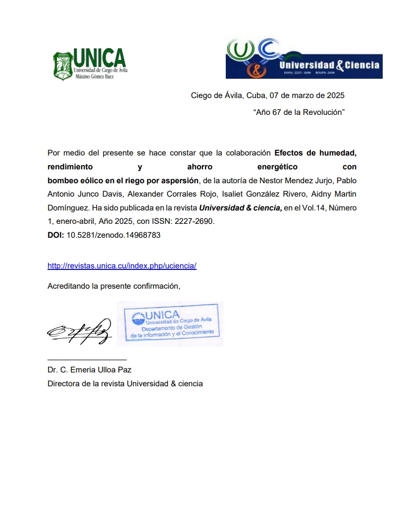 Introducción: El uso de bombeo eólico para riego por aspersión elimina la necesidad de combustibles fósiles, lo que reduce significativamente el consumo de energía. El ahorro energético depende de la disponibilidad y la calidad del recurso eólico en la ubicación específica, esto permitió un ahorro energético de 27,66 kWh, lo que representa una cantidad de 146,77 kg de CO2 equivalente por hectárea, que se dejó de emitir a la atmósfera. El bombeo eólico puede ser una opción rentable en áreas con buen potencial eólico y altos costos de energía convencional. Objetivo: determinar los efectos de la humedad, ahorro energético y rendimiento en el cultivo del ajo con el sistema de riego por aspersión al mínimo costo posible. Método: El sistema de riego es accionado con energía eólica a través de un molino multipala con altura de la torre de 10 m. Para el diseño del molino de viento se partió de los siguientes datos iniciales adoptado según la experiencia de los productores y criterios técnicos establecidos para este tipo de dispositivo. Resultados: Los resultados muestran para estas condiciones de velocidades del viento incidente la potencia útil de la aerobomba se incrementa según los valores de revoluciones del rotor eólico que oscilan entre 18,95 y 90,95 rpm, con un coeficiente de potencia de 0,22 acorde con las condiciones climatológicas del lugar y las características específicas del molino de viento diseñado. Conclusión: se obtuvo que el caudal teórico y real de la bomba volumétrica varía proporcionalmente con la velocidad del viento incidente, la precipitación total en ese periodo es de 169,46 mm, se observa que a partir del régimen de precipitaciones de la localidad; sin embargo, la que puede ser aprovechable por el cultivo es de 61,67 mm para un coeficiente de aprovechamiento de la lluvia de 0,36. además en las tres campañas evaluadas el rendimiento del cultivo alcanzó valores de 4,38 t/ha-1; 4,51 t/ha-1 y 4,46 t/ha-1 respectivamente, con un promedio de 4,45 t/ha-1.